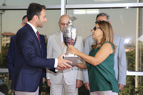 Koşuyu kazanan atın sahibi Mert Bayır'a kupasını, merhum Mehmet Kemal Karamehmet’in kızı Neslihan Karamehmet Yılmaz verdi.