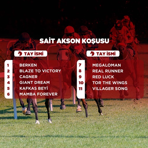 Kulübümüzün Kurucu Üyelerinden merhum Sait Akson adına gerçekleştirilecek koşu, 3 yaşlı safkan İngiliz taylarının Gazi öncesindeki bir diğer önemli provası olması yönüyle dikkat çekiyor. 2200 metre mesafede koşulacak bu prestijli yarış, çim pistte düzenlenecek. 2021 yılı Sait Akson Koşusu'na şu isimler kayıt oldu;