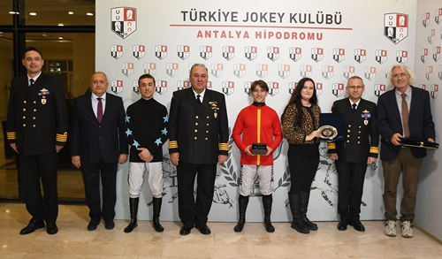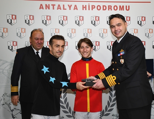 Jokeyler Görkem Özçelik ve Kadir Tokaçoğlu'na da plaketi Sahil Güvenlik İdari Başkanı Sg. Alb. Mutlu Çelik takdim etti.