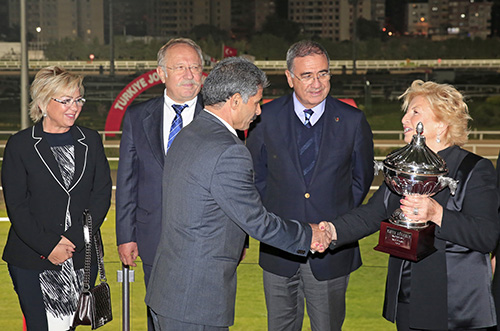 Koşu sonrası düzenlenen törende, koşuyu kazanan atın sahibi Nafi Aslansoy'a kupasını, Nurbiye Gülerce verdi.