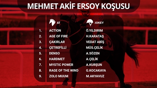 1873 yılında İstanbul’da doğan Mehmet Akif Ersoy, ilkokul yıllarında babasından Arapça dersleri almaya başladı. Ortaokul eğitimi boyunca Arapça, Farsça ve Fransızca öğrendi. 1882 yılında Esad Dede Efendi’nin İran Edebiyatı derslerine katılan Ersoy, ilk şiirlerini bu dönemde yazdı. 1893 yılında Ziraat ve Baytar Mektebi’nden mezun olan Ersoy, Ziraat Bakanlığı’nda veteriner hekim olarak görev yaptı. 1908 yılında II. Meşrutiyetin ilanıyla birlikte yayın dünyasına girdi. Kısa bir süre sonra Darülfünun Edebiyat-ı Umumiye müderrisliğine tayin edildi. 1913 yılında İttihat ve Terakki Cemiyeti’ne katıldı. Milli Mücadele döneminde kurtuluş hareketine destek verdi. Şiirleri, Sırât-ı Müstakîm Dergisi’nde yayımlandı. 1920 yılında Burdur Milletvekili seçilerek, Büyük Millet Meclisi’ne girdi. 17 Şubat 1921’de İstiklâl Marşı’nı yazdı.18 Mart 1921’de meclis tarafından milli marş olarak kabul edilen şiir, 1924 yılında Osman Zeki Üngör tarafından bestelenerek “Türkiye Cumhuriyeti’nin Milli Marşı” olarak ilan edildi. Şiilerini 8 kitaptan oluşan Safahat adlı eserde topladı. 1936 yılında aramızdan ayrılan değerli Türk şairi Mehmet Akif Ersoy’u, anısına düzenlenen bu koşu vesilesiyle saygı ve rahmetle anıyoruz. İbrahim Kirazoğlu Koşusu (KV-8/Dişi) - 16.30 1988 yılında yaşamını yitiren kıymetli devlet adamı ve Asli Üyemiz merhum İbrahim Kirazoğlu'nun anısına yapılacak mücadelede, 3 yaşlı dişi safkan İngiliz tayları 2200 metre mesafe çim pistte boy gösterecek.